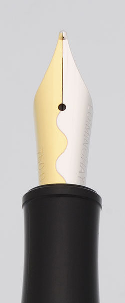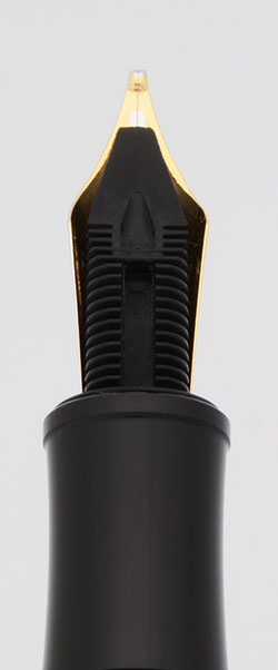 Nib BROAD two-tone 18k gold (marked 750) nib. Very smooth.