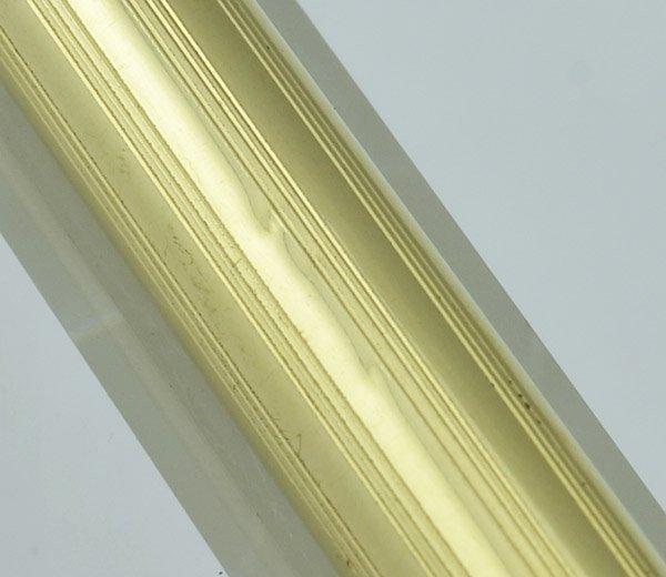 Color Gold filled finish and trim. There's a pattern of small groups of three lines which runs down most of the barrel.