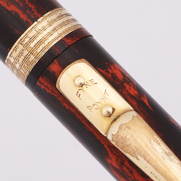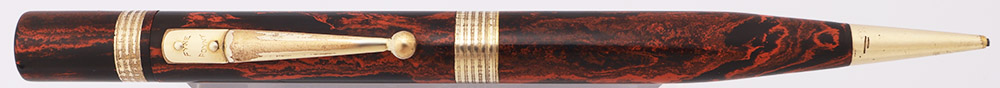 Condition Excellent condition with no cracks. The cone has a couple of dents and scratches, as well as brassing around the tip. The body of the pencil is quite nice. There are some small scratches, but no cracks or chips. Both of the bands, around the center and near the top, have some dots of plating wear. The main part of the clip is mostly brassed, but the top part that's attached to the pencil still has most of its plating. The imprints are clear.