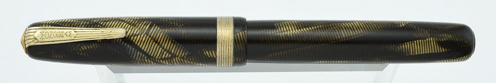 Color Gorgeous brown colored finish with black lines, this is one of the "snakeskin" patterns of ringed celluloid. Gold plated trim.