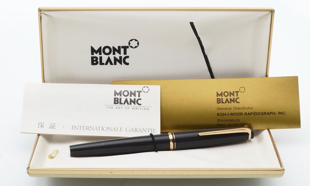 Condition Excellent condition, in box, with paperwork. No cracks, chips, dents, or dings. This is a handsome pen in a subtle color. The cap has light scratching. There is a small chip on the top of the cap at one edge of the Montblanc emblem. The barrel has light to moderate scratching. Scratches are difficult to see on this pen because of the dark coloring. The cap band looks great. The clip has some light plating wear at the very top. The ecru box is in beautiful condition. The imprints are clear.