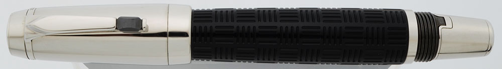 Color Black resin with a grid guilloche pattern, and platinum plated trim. Similated onyx set in clip.