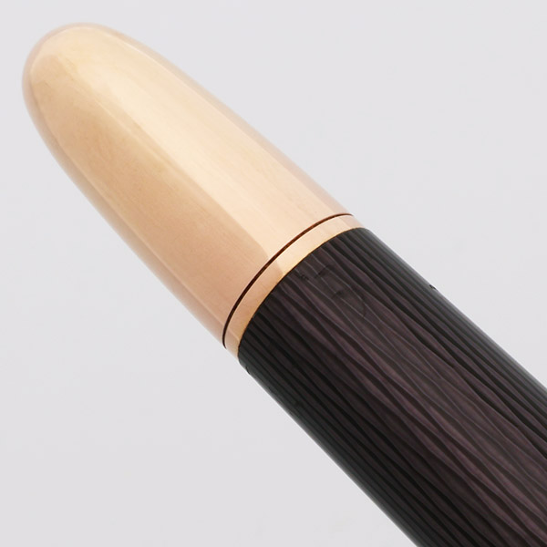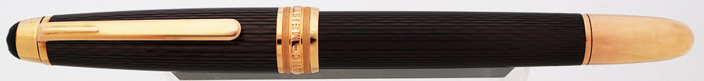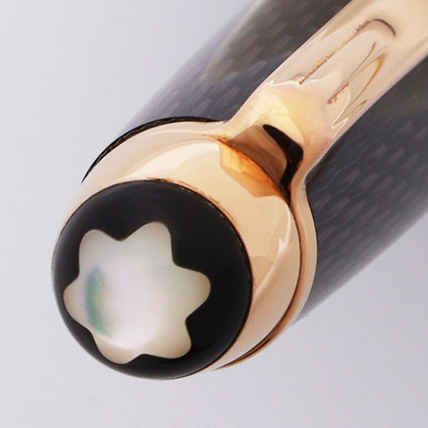 Color Black guilloche patterned barrel. Rose gold-plated trim, including finials, cap band, clip, section, and nib.