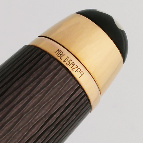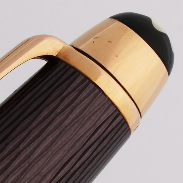 Condition Very nice condition, excellent were it not for the fact that the back end of the barrel portion has some moderate to heavy scratches and scrapes, probably from aggressively posting the cap. We have photographed all these issues below. There are some scratches around the sides of the rose gold cap finial. The clip also has light scratching, but there's no plating wear. The cap has very light scratching on the surface. There is some plating wear in the cap threads. The The textured surface distracts the eye from these fairly well, but they're fairly obvious. Other than those notes, there are light polishing marks and handwear. No cracks, chips, dents, dings, or personalization. The trim looks great and the imprints are clear. It's working well. In Montblanc box, but probably not the original box.