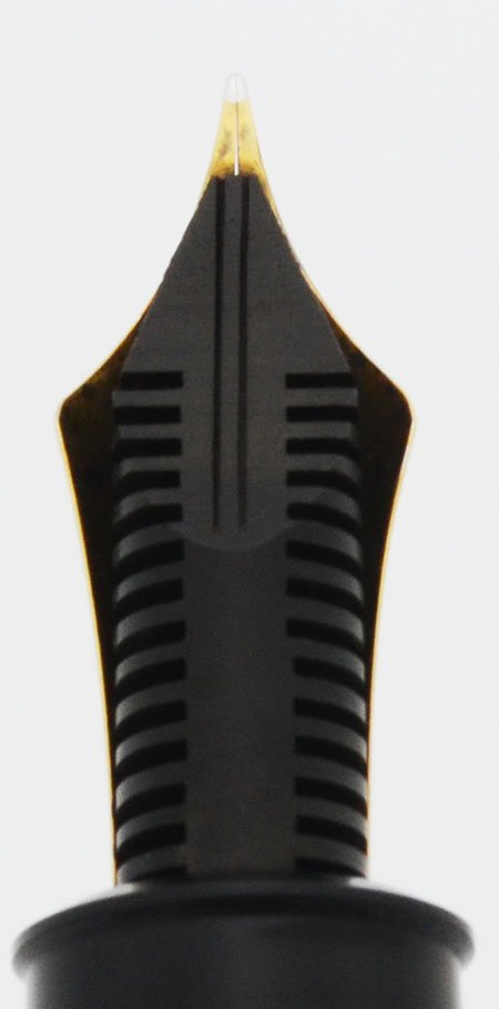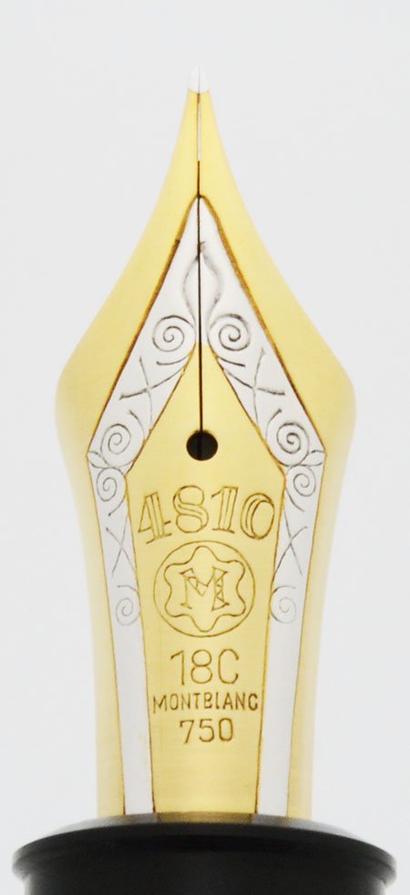 Nib MEDIUM 18k Nib. The nib is a very springy tri-tone 18C Montblanc 4810 nib. The pen has a round ebonite with grooved face feed. The nib is quite soft. The barrel has an "F" sticker on it for fine but it is a bit on the broader side for a Montblanc nib.