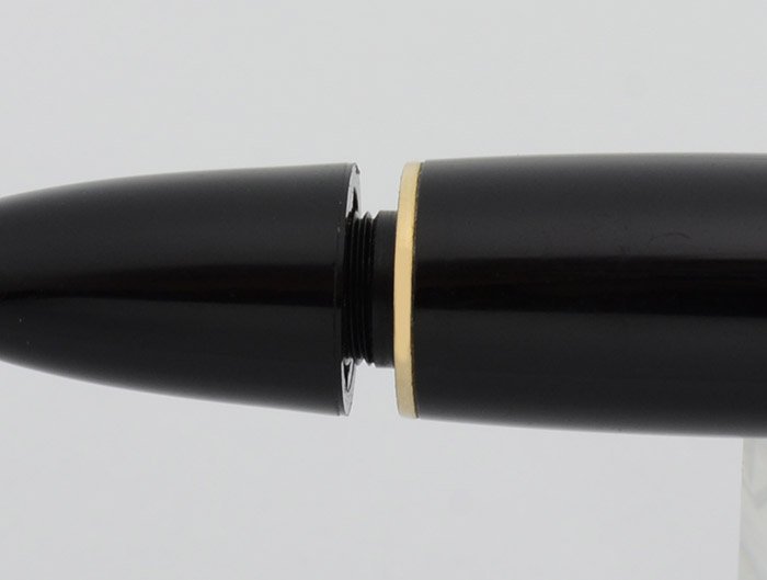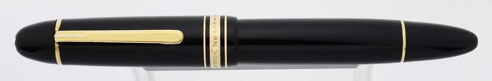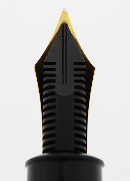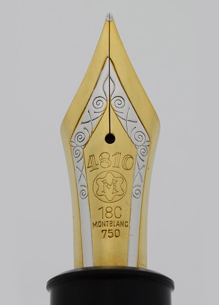 Nib MEDIUM 18k Nib. The nib is a very springy tri-tone 18C Montblanc 4810 nib. The pen has a round ebonite with grooved face feed.