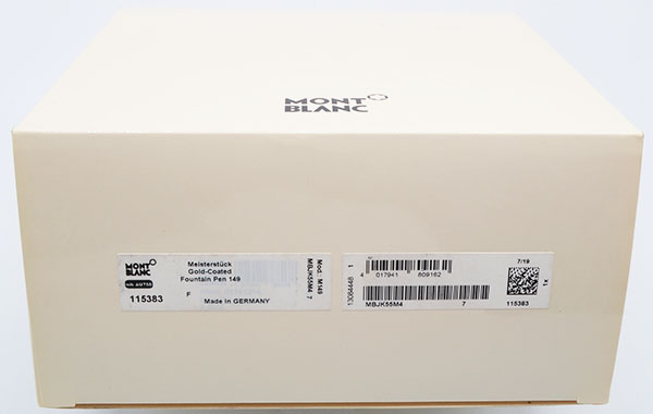 Manufacturer and Year Montblanc, Germany -- 2010s. The pen has brass piston threads, a two-section barrel, and 18K tri-tone nib, all of which characterize the 149 from 1996 through now. Additionally, the guarantee certificate is signed by the original retailer as having been purchased in August 2019, so this pen was likely made in the last few years.