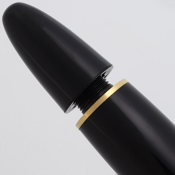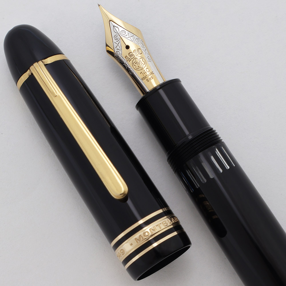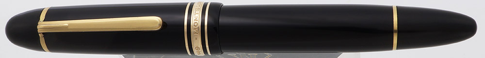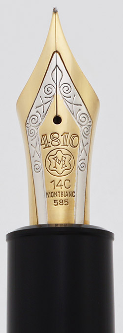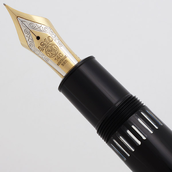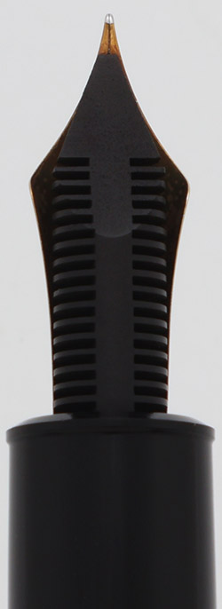Nib FINE 14k Nib. The nib is a springy tri-tone 14C Montblanc nib (yellow gold with a silver masked strip in the middle). Not enough flex for notable line variation. The pen has an ebonite feed.