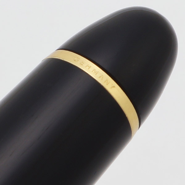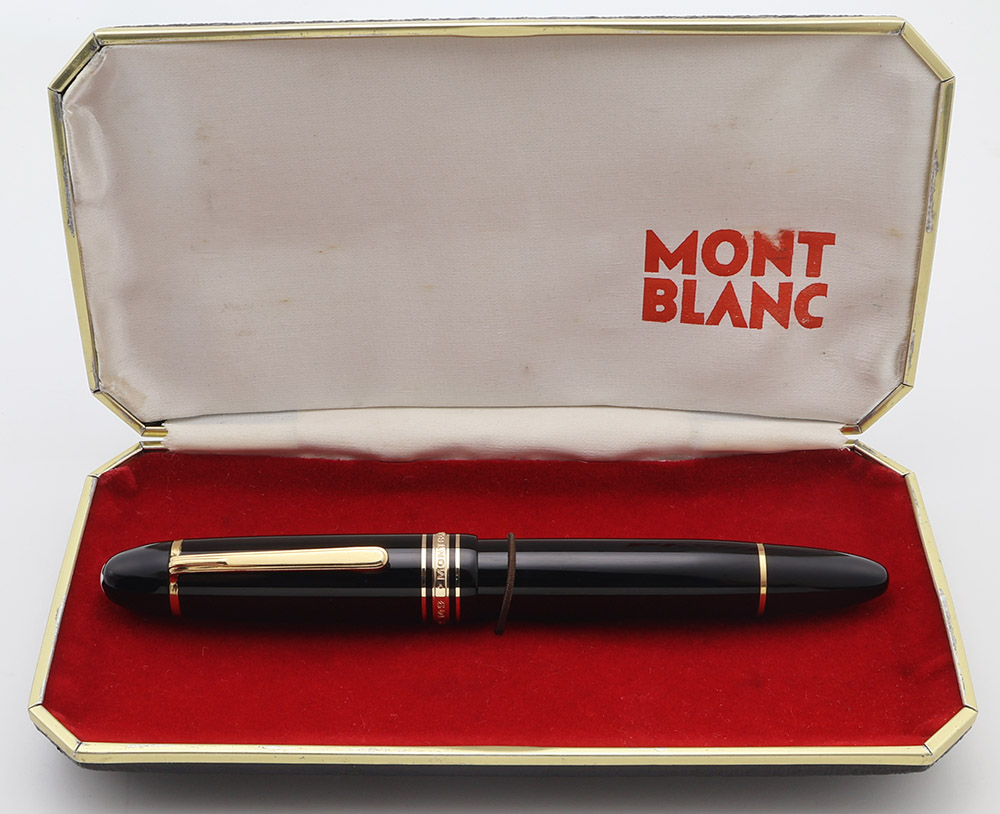 Condition Excellent + condition. There is light microscratching, with scattered light marks on the cap and barrel, but no individual, significant marks or scratches. The clip ring has some brassing along the edges, and some horizontal lines or scratches, perhaps part of the original machining process. The Germany imprint on the clip band is somewhat shallow, but still easily visible. The clip has light scratching, and some plating wear near the open end. No cracks, major scratches, or dents on the pen. The plastic piston seal and the viewing window are very clear. Ships in Montblanc box.