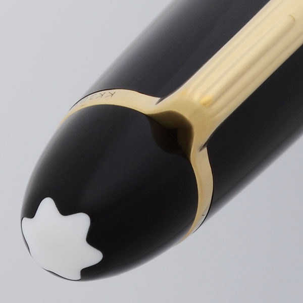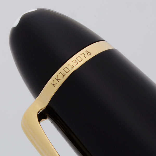 Color Black precious resin with gold plated trim. The clip ring has a serial number "KK1013078". There is a white Montblanc emblem on the top of the cap.