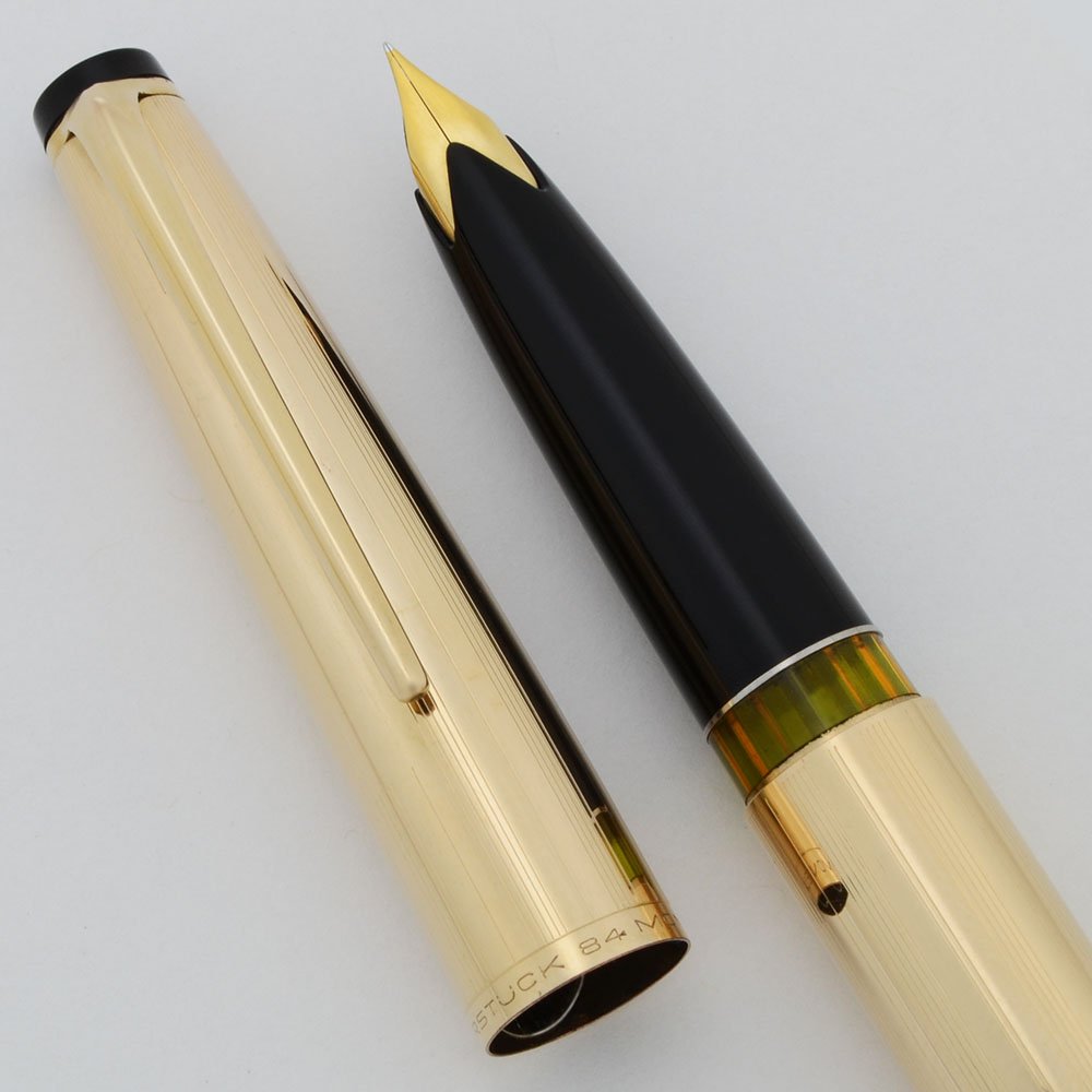 Color Lined gold-filled cap and barrel. Black section with viewing window. Waterman emblems on top of cap and at the end of the barrel.