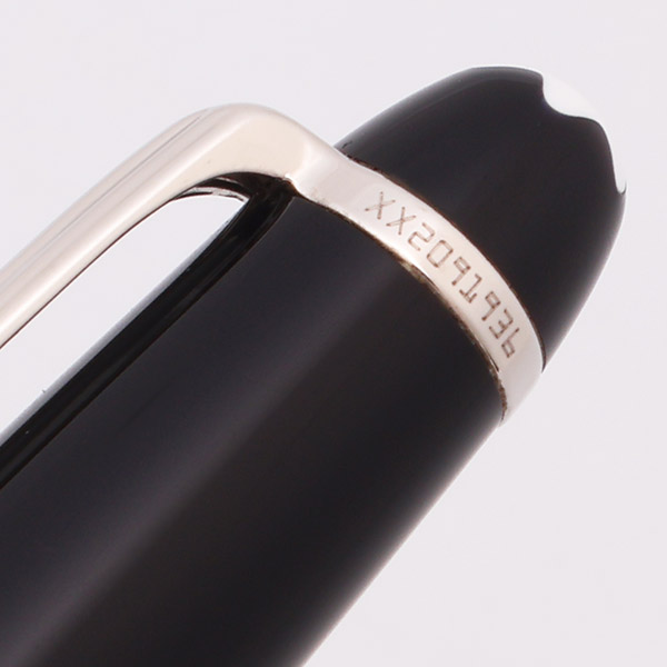 Color Black with platinum plated trim. There is a white Montblanc emblem on the top of the cap. The clip band has a serial number, XX2091936 etched on it.