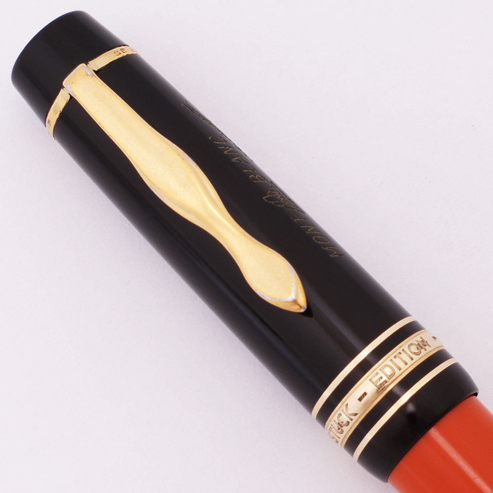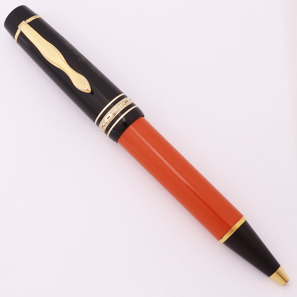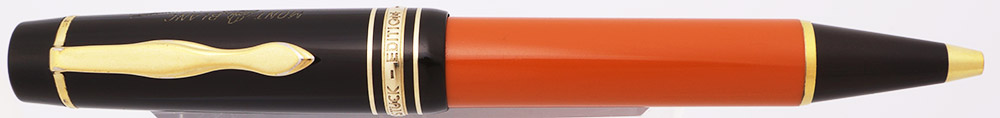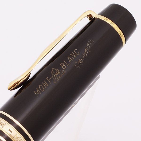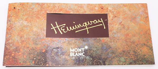 Condition Excellent condition. This is a fat, colorful pen that features a replica of Ernest Hemingway's signature on the cap. The cap and barrel have light to some moderate wear. The gold trim on the cone has brassing and some dots of pitting. The dark section of the cone has some scratching and wear. The clip has plating wear around the open end and on the "shoulders" at the top of the clip, and there is brassing on the clip ring. The rings around the barrel look nice. The top of the cap, including the white Montblanc emblem, has some scratches and surface marks. The imprints are clear. Also included are the booklet and warranty card that originally came with the pen, but NOT the original box.