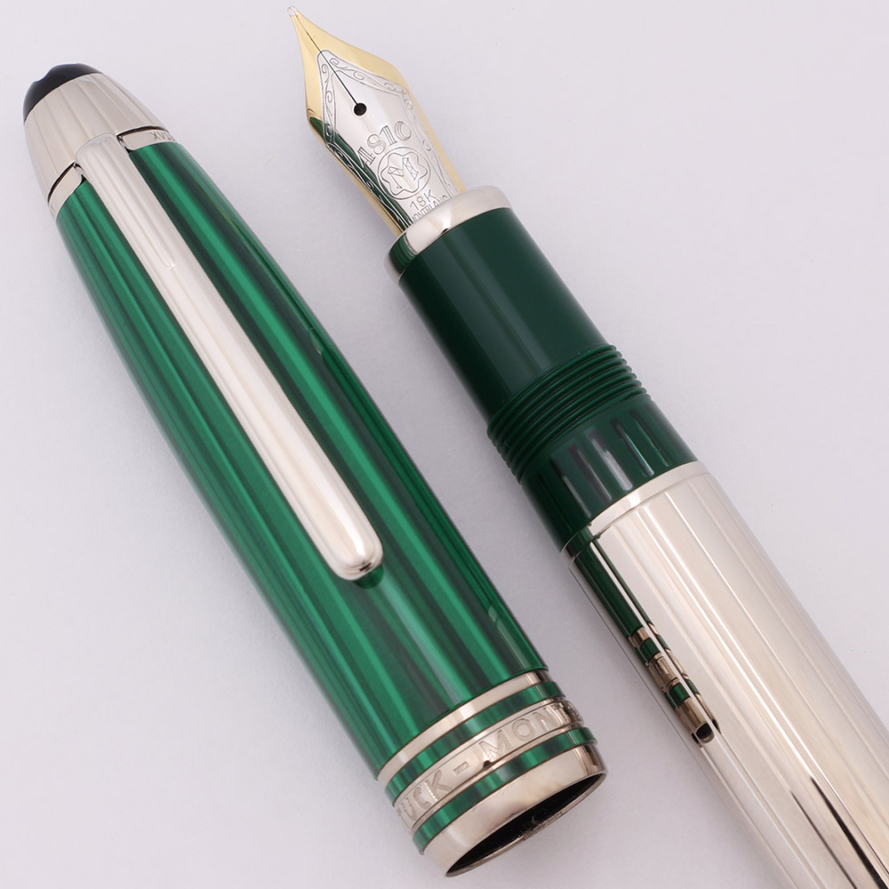 Color The barrel is "platinum finished", and the cap is covered in malachite (specifically, malachite mineral ground to a powder and mixed into resin, which is then masterfully painted onto the surface to mimic the natural banding pattern seen in the stone). The clip band has serial number XV1330483 etched on it as well as "Germany". The section is green, and there are windows to view the ink level.