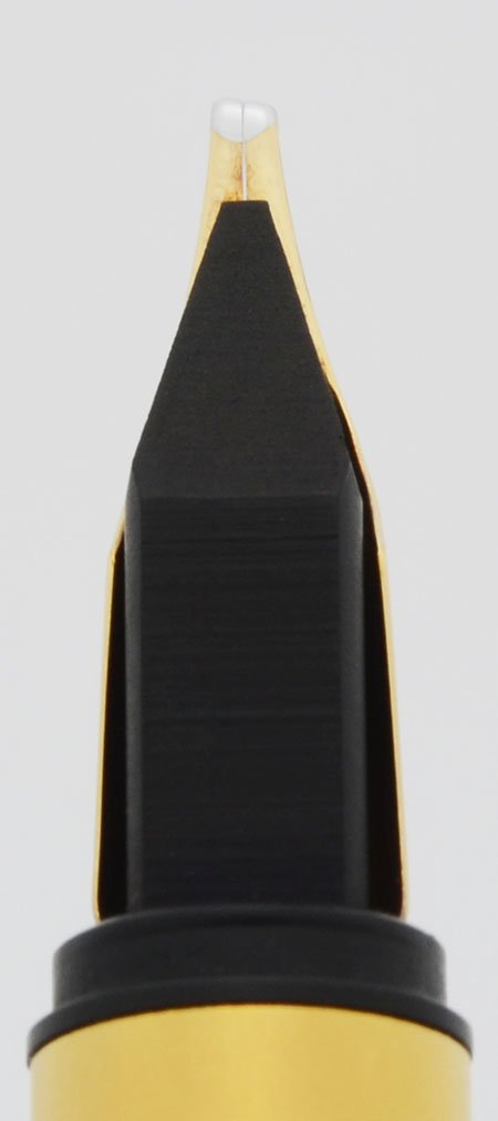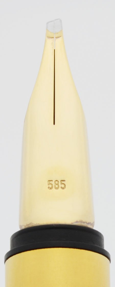 Nib Broad left oblique 14k nib. Its only label is 585 which verifies the gold content. It's smooth with lovely tipping material and springy.
