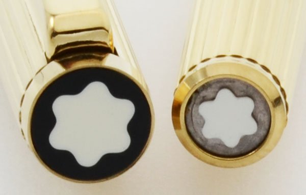 Color Gold plated finish in a pattern of vertical lines with a lined design with a matte gold colored section. There's a white Montblanc icon on either end of the pen.