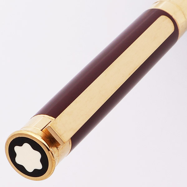 Color Burgundy with gold plated trim. The end of the cap has the Montblanc emblem over black. Matte black section.