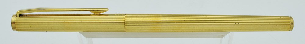 Color Gold plated finish in a pattern of vertical lines with a lined design with a fogged gold colored section. There's a black Montblanc icon on either end of the pen, though the one on the end of the barrel has faded to a lighter color.