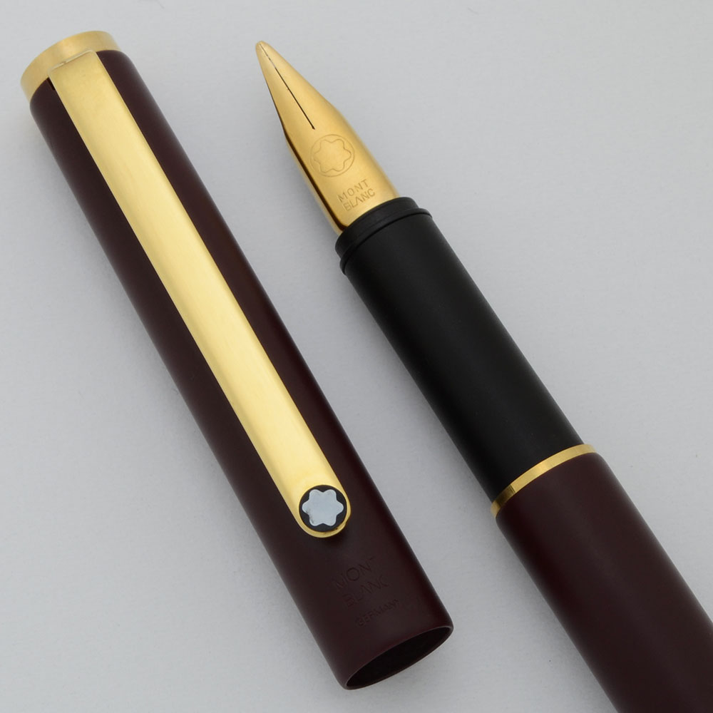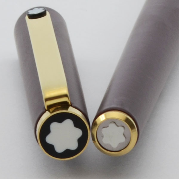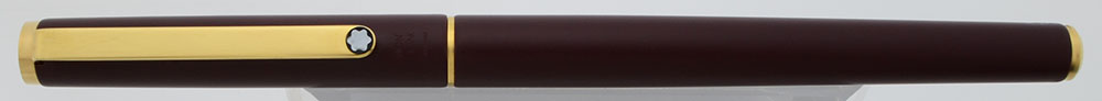 Color Matte burgundy with gold plated trim and a Montblanc icon on the end of the cap, barrel, and clip (3 icons in all). Matte black section.