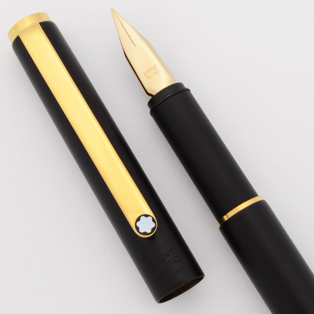 Color Matte black with Montblanc icons on cap and at end of barrel. The cap icon is white with black trim. The bottom icon is white with gold trim.