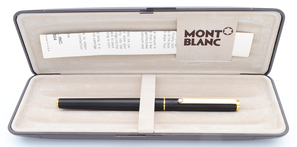 Condition Near mint condition, in box with paperwork. No cracks, chips, dents, or dings. This is a slim and sleek pen. The cap and barrel look fantastic with no scratches. The trim has microscratching and polishing marks. The Montblanc icons all look great (there are three in all, including at the end of the clip). The box is brown plastic and is in excellent condition. The imprints are clear.
