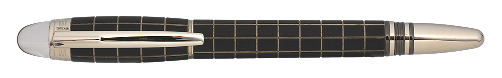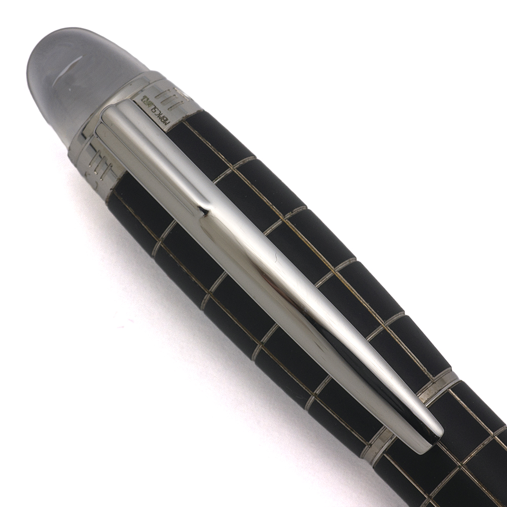 Color Matte black rubber finished body with a diamond-cut grid pattern. The trim is platinum plated. The Montblanc logo floats in the clear cap finial and is visible when looking at the cap straight on. The end of the pen is threaded for the cap.