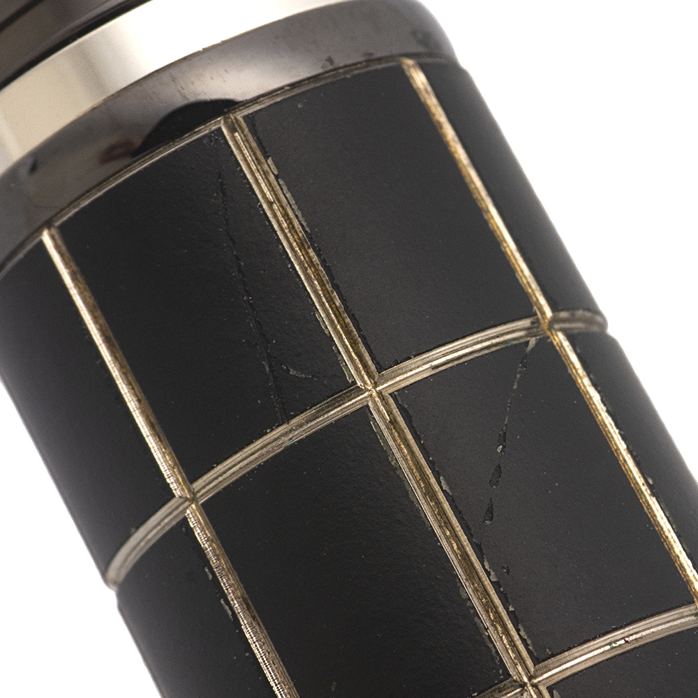 Condition Very nice condition, in box, with paperwork. This is a uniquely designed, heavy rubber pen with shiny platinum plating. The cap and barrel grids are crisply outlined. There is some light chipping and wear along some of the grid edges and there are a few deep scratches in the rubber material at the end of the barrel. The pointed cone at the end of the barrel has microscratching as does the shiny section and rollerball cone. The clip looks excellent. There are a few dots of pitting on the upper edge of the clip band. The clear cap finial and the floating Montblanc logo look great. The imprints and serial number are clear.