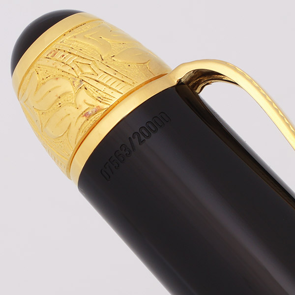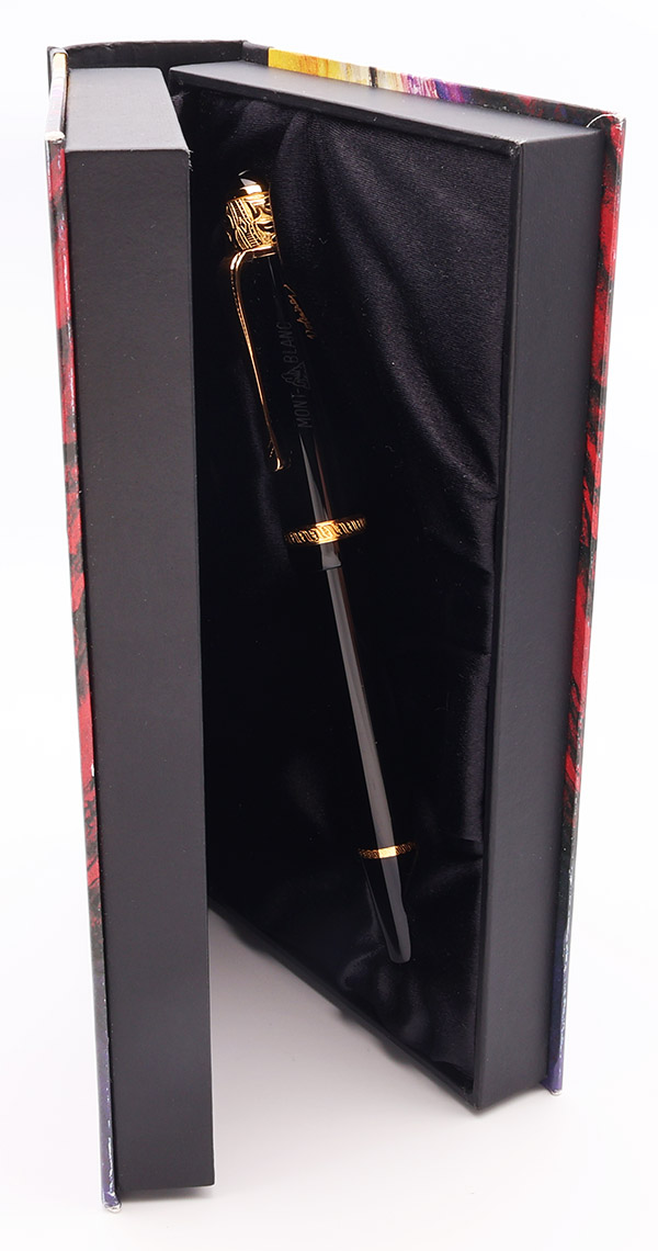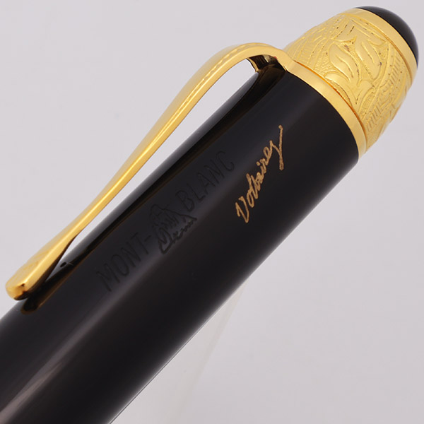 Condition Near mint condition, in box. There is a faint scratch near the end of the barrel, about 3/4" long. The rest of the barrel has microscratching, and very light handling wear. The pen was dipped in ink, but we don't find much evidence indicating that it was actually inked. The vermeil bands (at the top of the cap and near the cap lip) have tiny bits of patina on the gold plating, but otherwise look great. There is no brassing or plating wear on the clip and the rest of the trim. Overall, the pen looks great, but it doesn't quite look brand new. The pen ships in a Montblanc Writers Edition Voltaire box. The mechanism that would normally keep the box closed is misaligned somehow, and the box won't snap closed or open fully; the way it's pictured below is how it looks. The imprints are crisp and clear.