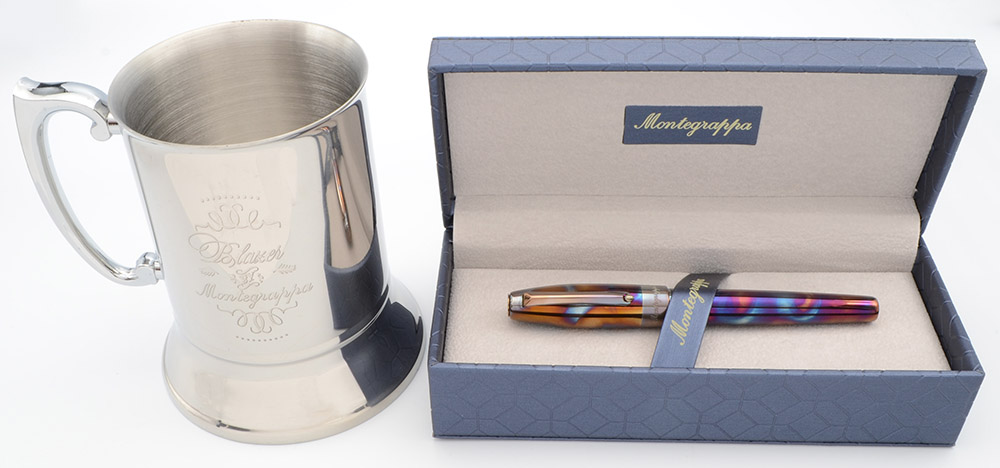 Condition Near mint condition, in box, with paperwork and a stainless steel tankard (more on this below). There are scattered microscratches on the barrel and cap, visible under magnification but largely camoflaged by the colorful finish. No cracks, chips, dents, or dings. This is a gorgeous, elegant, fat pen that is impressive. The imprints are clear.