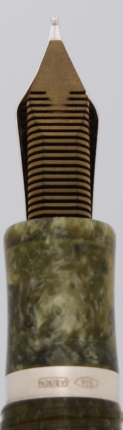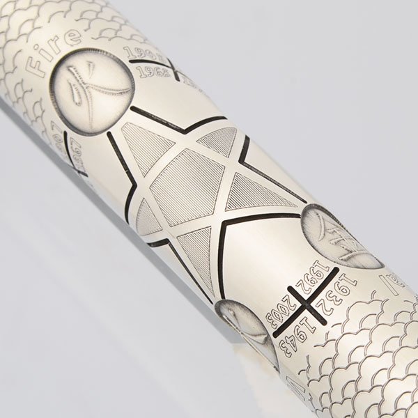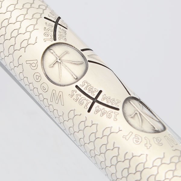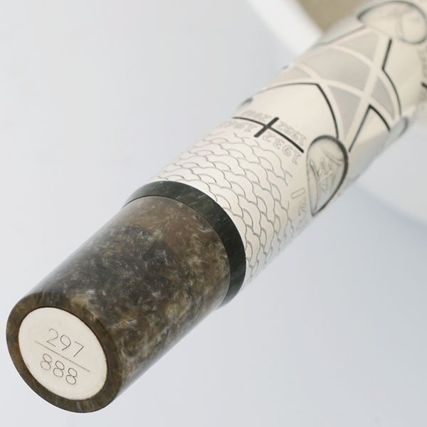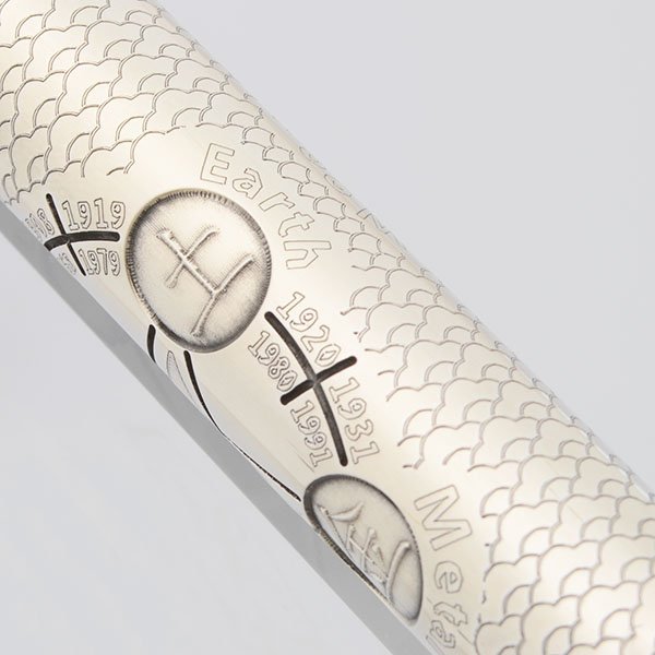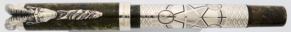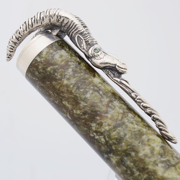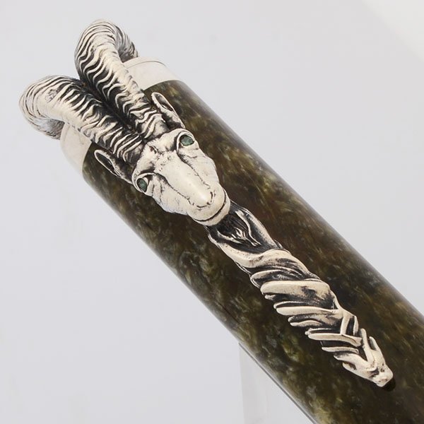 Color Pearlized green resin, with many sterling silver highlights. The central part of the barrel has a sterling overlay, which is etched with symbols for the five elements (fire, earth, metal, water, wood), as well as calendar years corresponding to the Years of the Goat and each element. Cap is the same green resin, and features an elaborate sterling goat's head clip, with emerald eyes.