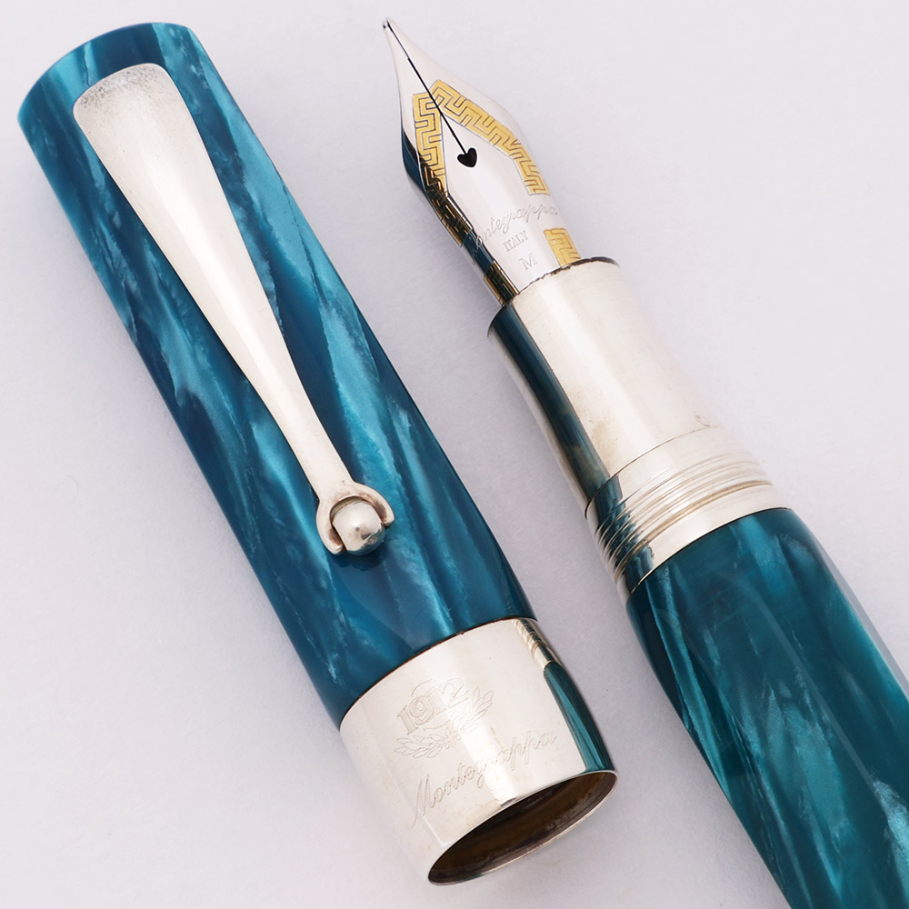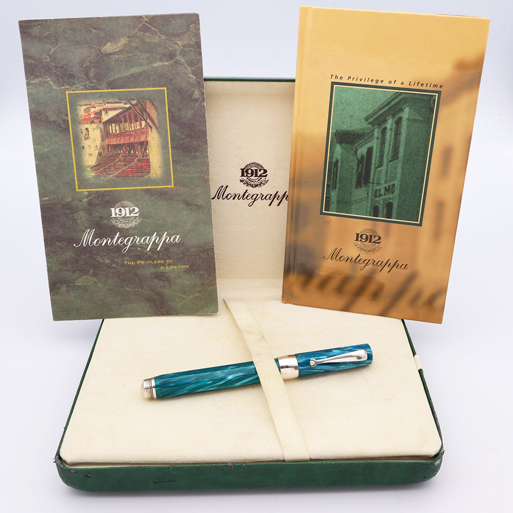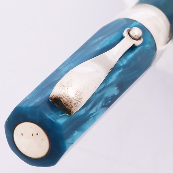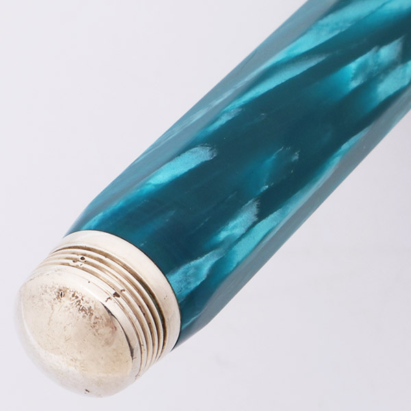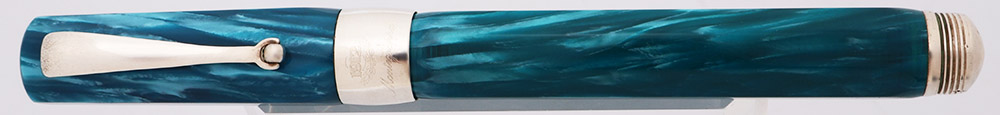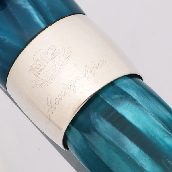 Color Blue marble pearlized celluloid (according to pg 55 in the accompanying book) with sterling silver trim, a wide 7/16 inch wide cap band marked 1912 Montegrappa, and a sterling end piece with threads in it for posting the cap.