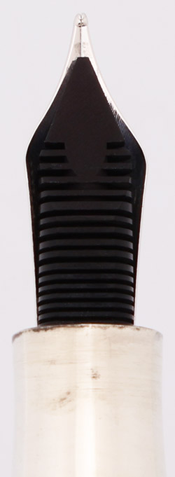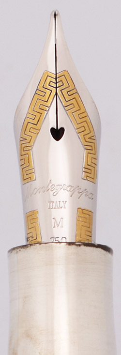 Nib Medium 18k gold two-tone nib, mostly silver colored with a greek key design in gold. It has lovely tipping, and is soft feeling.