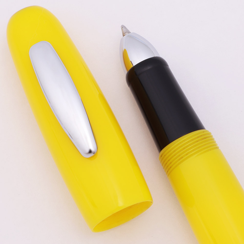 Color Yellow resin body with lots of rounded features and chrome trim. The gift box includes the pen, three additional tips, a bottle of black ink, two ink cartridges, and an extra cap that is black with chrome trim.