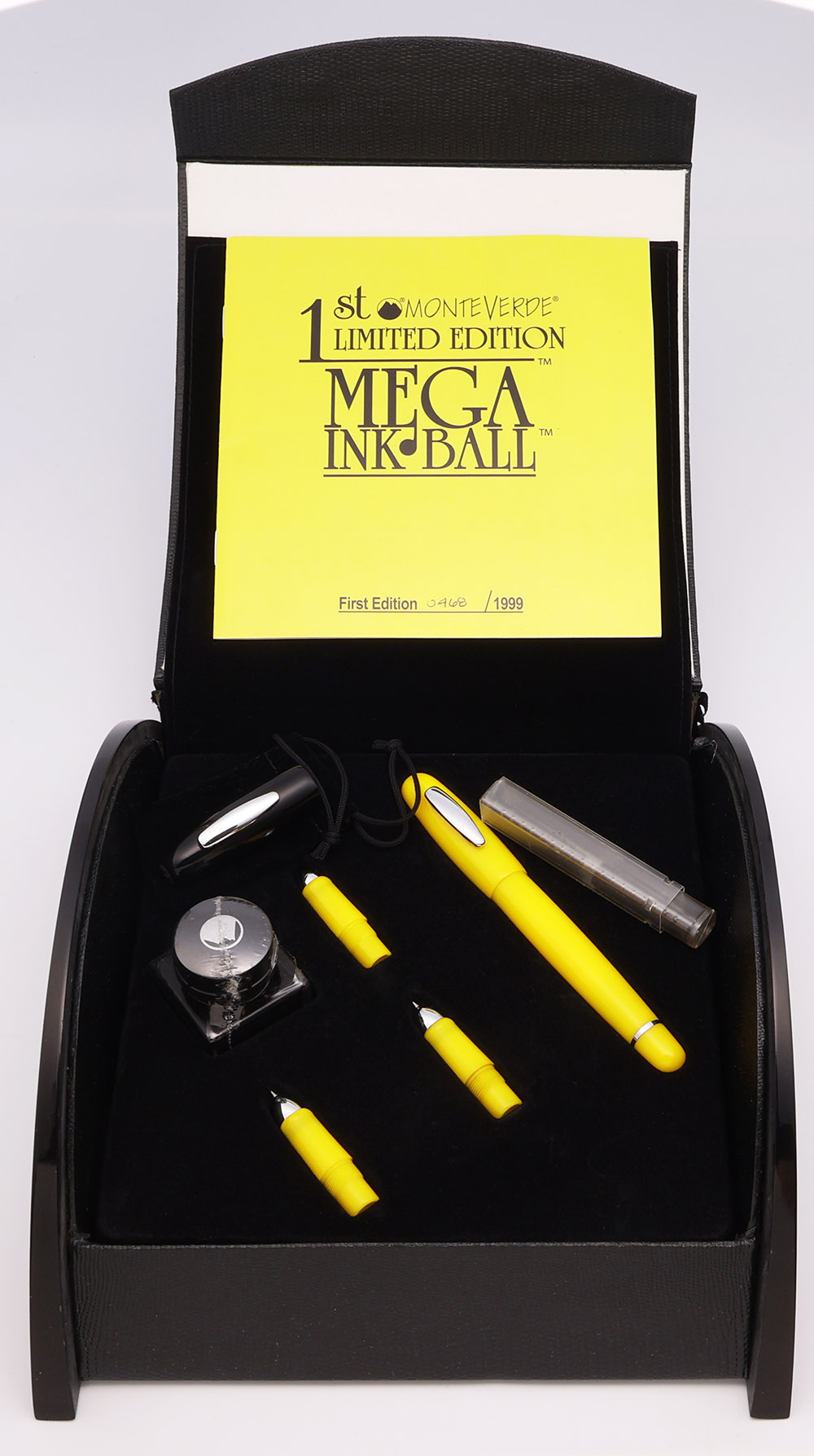 Condition Near mint condition, with paperwork, in limited edition gift box, with accoutrements (three additional tips, a bottle of ink, a black cap with chrome trim, and two ink cartridges). The yellow pen looks excellent. The coloring and surface has some texture so it is difficult to see scratches. The pen looks excellent, shiny, and near mint. The chrome has microscratches both on the capped pen in the box and on the additional pen tips. The clip has microscratching. The black cap with chrome clip has light microscratching. The imprints and limited edition numbering are clear.