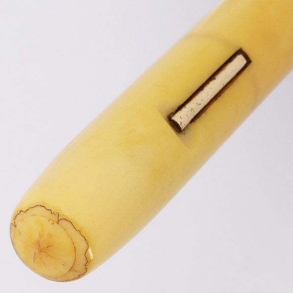 Condition Excellent condition for this ivory colored, shiny pen that has classic 1950s styling. The barrel has marks caused by the cap lip, and moderate scratching with some long scratch marks included. The end of the barrel has some cracking. The brushed silver section has some microscratching, and near the very front underneath the nib there is a bit of pitting and perhaps tool marks. The nib itself is slightly twisted, but once you find the "sweet spot" it's an excellent writer. The cap has light to moderate scratching with a few faint hairline cracks along the top edge of the clip where it goes over the top of the cap. The lever has brassing and plating wear. The cap band has moderate microscratching, and a few larger scratches. The clip has moderate microscratching and some plating wear along the edges. The imprints are clear.