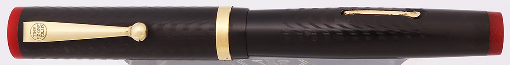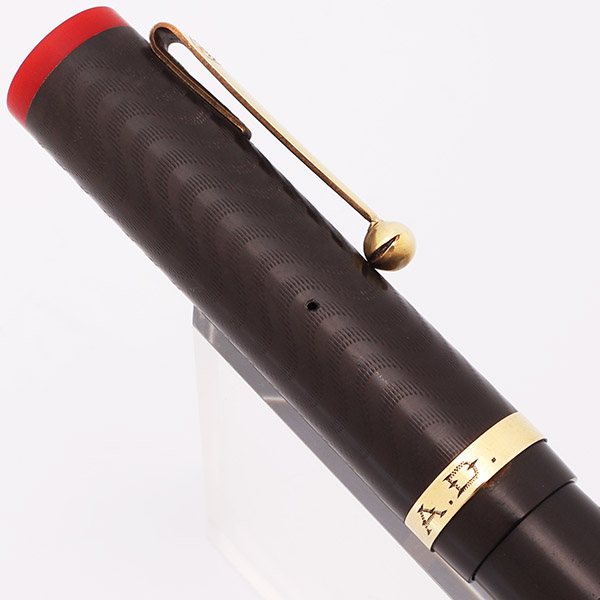 Condition Excellent condition with no cracks, dents, or dings.. This is a small lever filling fountain pen in black chased hard rubber with unique red end pieces. The color on the cap and barrel have mellowed to a dark chocolate brown as opposed to the dark black that can be seen on the section. The barrel has marks caused by the cap lip and light surface wear. The red end piece is quite "crackled". The cap looks great. The red top piece has a few small chips along the top edge and has light scratching. The cap band has light to moderate microscratching. It is personalized, "A.D.". The clip has very light microscratching -- it looks great. The imprints are clear.