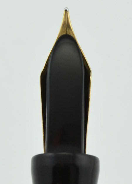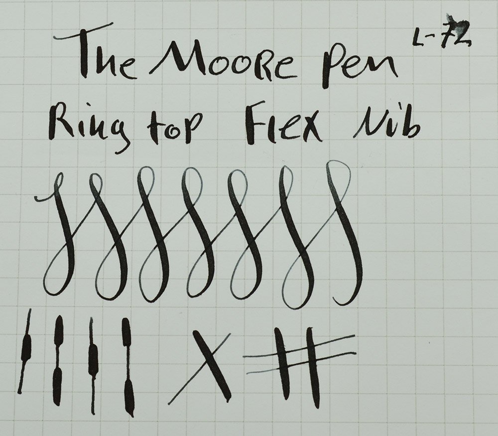 Nib Fine Flexible gold nib. It says, "The Moore Pen 2." The pen flexes with minimal pressure and can go further. It has very nice hairlines. See the writing sample below.