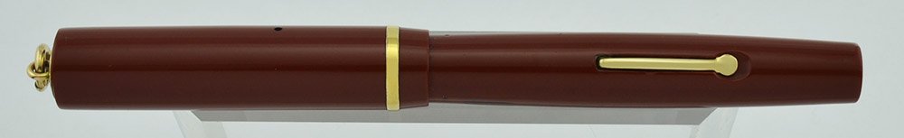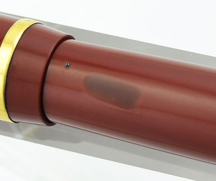 Condition Very nice lightly used condition. No cracks or serious scratches, just signs of very light use. The gold plating is in excellent condition. The imprint is very readable. There is a shaved off piece of the barrel that is a darker red than the rest of the pen to the left of the lever. There are two very small round pin-sized marks in the plastic, one of which you can see in the photo.