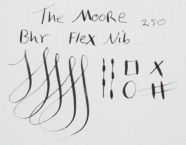 Nib FLEXIBLE FINE Moore nib. The nib has excellent hairlines and offers very nice line variation. Please see the writing sample below.