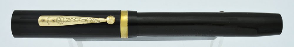 Condition Excellent condition, no cracks or chips or personalization. There's some wear, and hints of brassing on the lower edge of the cap band (see photos), along with some plating wear on the ball of the clip and just the very edges of the lever. The hard rubber has discolored only slightly, but it is still very dark. The imprint is a little worn, but still very readable. Overall the pen is looking quite attractive, with signs of light use, and it's working very well after our restoration process.