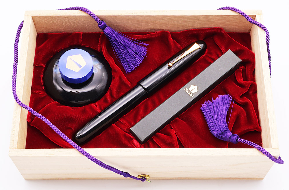 Condition This pen is in beautiful condition with very little sign of wear. Our inspection revealed some traces of ink. The cap and barrel are gorgeous, with just light microscratching. The clip has light polishing marks. The pen comes in a velvet-lined wood box, with a bottle of Pilot Namiki blue ink. The eyedropper that was originally supplied with the pen is missing, but we will include an eyedropper kit when the pen is shipped. Ships in original wooden box with outer cardboard box, a bottle of ink, polishing cloth, and paperwork.