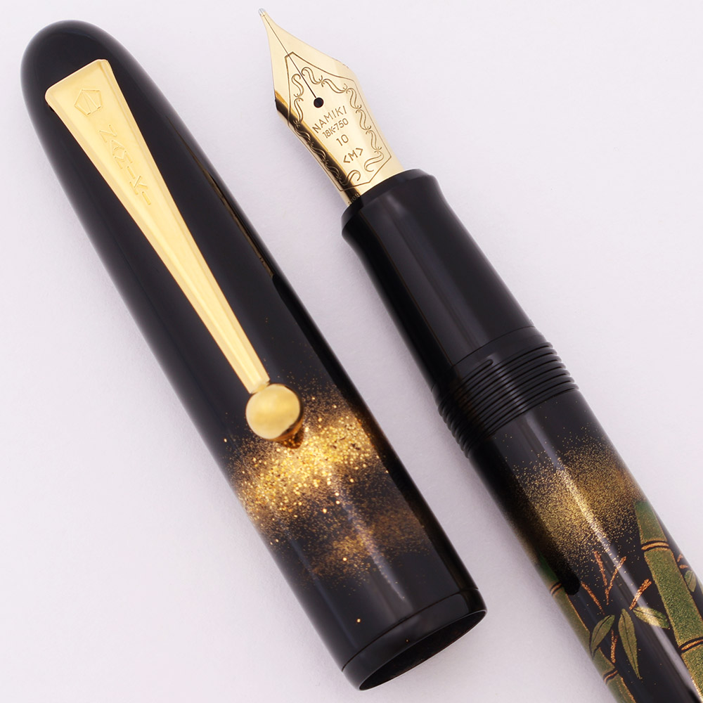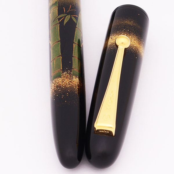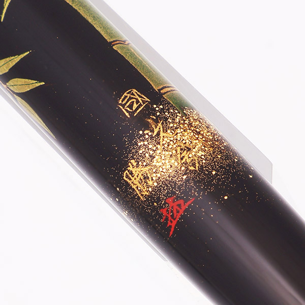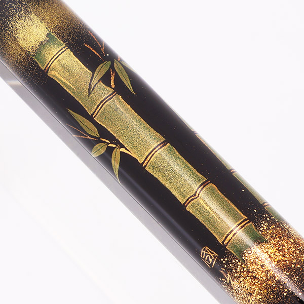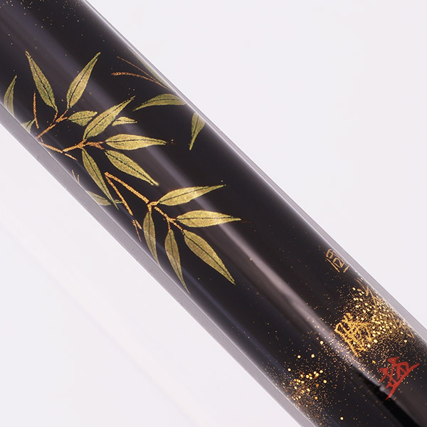 Color Black pen with bamboo stalks and gold embellishments, using the Togidashi Maki-e technique. Signed by the artist (Masaru Hayashi, still working today!). The trim is gold colored.