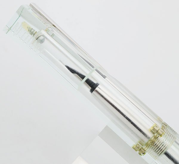 This pen has a unique square shape. The clip is set into a corner and doesn't interrupt the angular lines of the body. Section is round, so your fingers will grip the pen comfortably. If you have a large hand, note that this pen will not post, so the corners at the end of the barrel may dig into the webbing between thumb and index finger. Otherwise, the pen is quite comfortable in hand. The cap has magnets set into the four corners that hold it into place on the body when capped, while also allowing you to spin the cap if you're feeling fidgety in a long meeting.