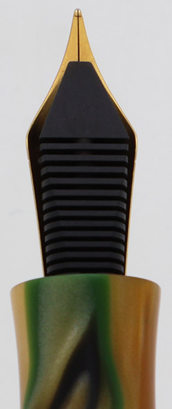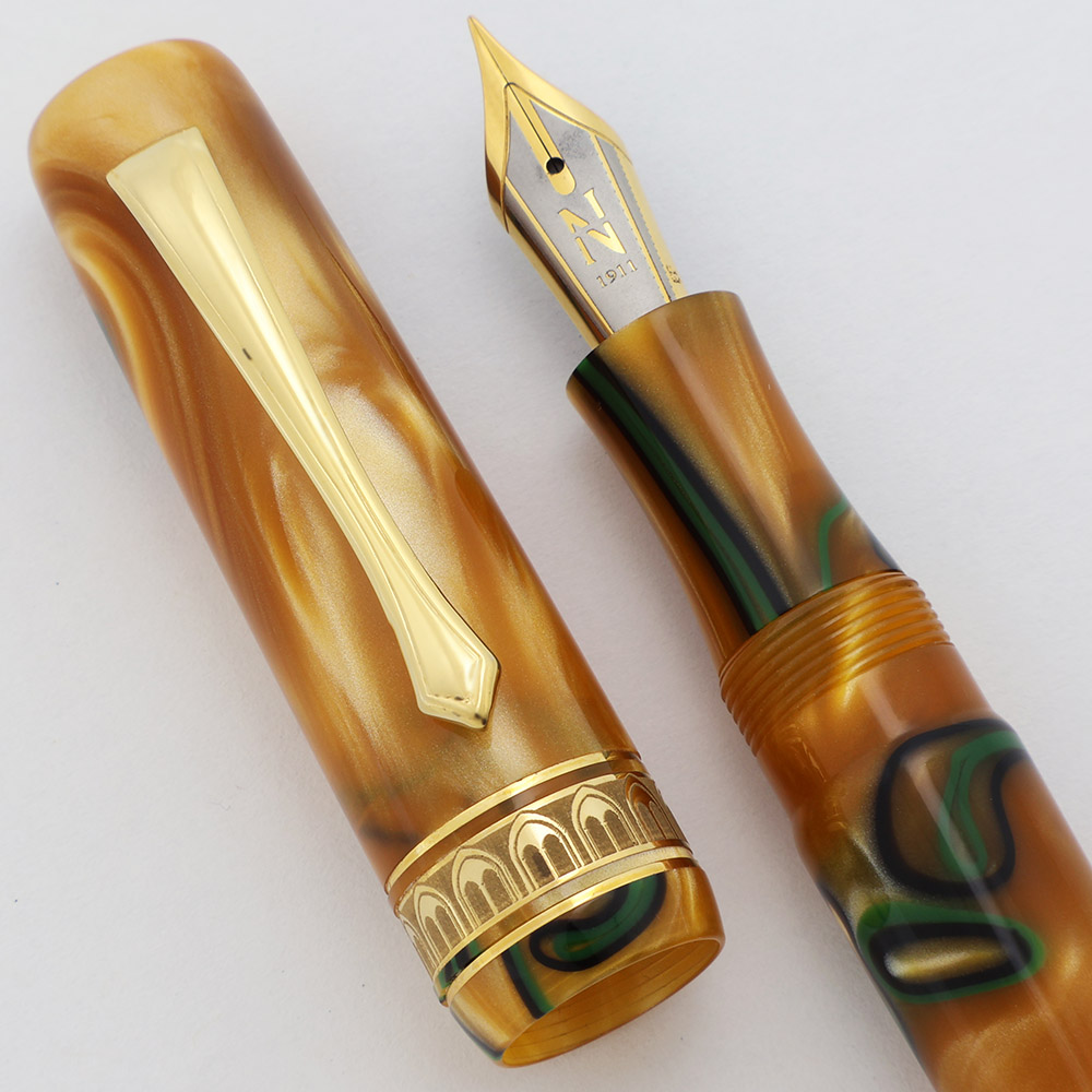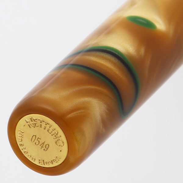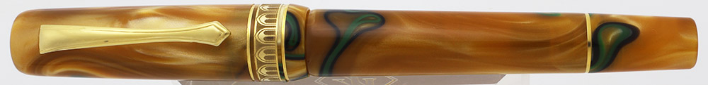 Condition Near mint condition with no cracks, chps, dents, or dings. This is a smooth, silky-surfaced pen in pearlescent tawny yellow with "orbs" floating on the surface in green with black outlines. It is lustrous and beautiful. It is numbered 0549 on top of the cap. The cap and barrel have some light signs of usage. The clip has light microscratching. The cap band looks nice with some small scratches and marks. The imprints are clear.