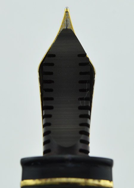 Nib Extra fine 18k nib. It started as a two-tone broad nib, labeled EF on the nib.