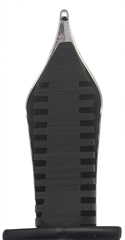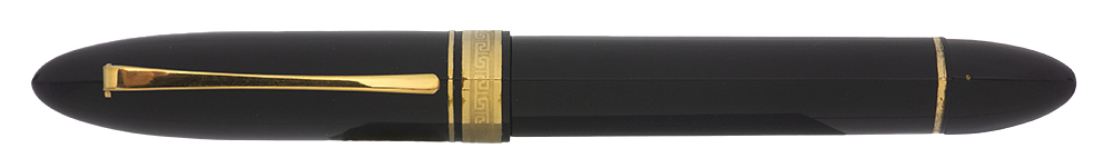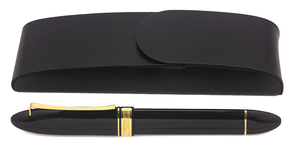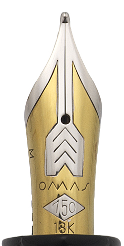 Condition Excellent condition, in a rigid two-pen Omas case. There are three nicks on the collar of the pen dead center in each of the three facets, visible in the nib photos. The barrel and cap have light to moderate scratching, especially on the peaks. The clip has scratching on the face and some touches of brassing around the open end. The cap bands have scratching, and touches of brassing and plating wear along the edges and on the corners. The narrower of the trim rings on the section has brassing and plating wear, and the wider patterned band has brassing on the edges. There are marks from capping on the section close to the barrel. The trim band at the end of the barrel, near the piston knob, has brassing and plating wear. No cracks, dings, or dents, or personalization. The imprints are clear, and the pen is working well.