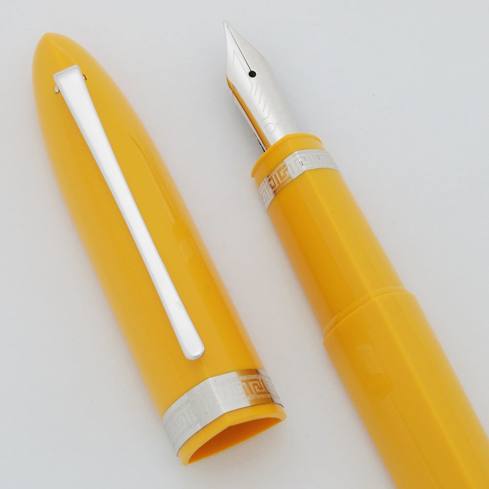 Condition New, mint condition, in original box, with paperwork. The pen comes in a leather sleeve. The pen has never been inked. No cracks, chips, dents, or dings. Though the pen is new, the clip has picked up some small scratches near the end. The imprint is in the same color as the pen so it is difficult to read, but it is crisp. This is a beautiful pen in a unique color.