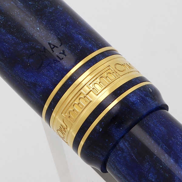 Color Azzurro Diamonte (Blue Diamond) with Gold Plated Trim. Diamondcast material. This color and model mimic the original celluloid created in 1930. The gold plated cap band has porticoes of Bologna.