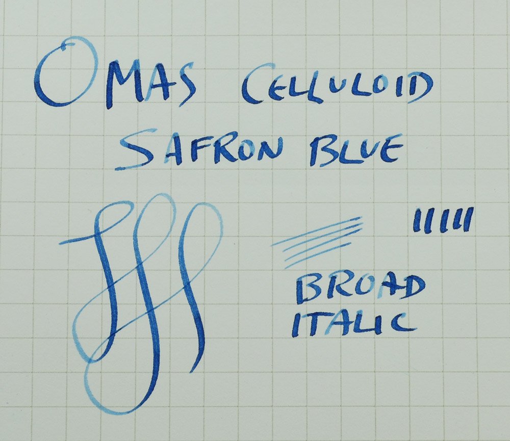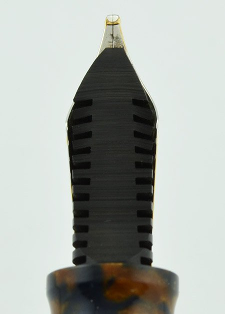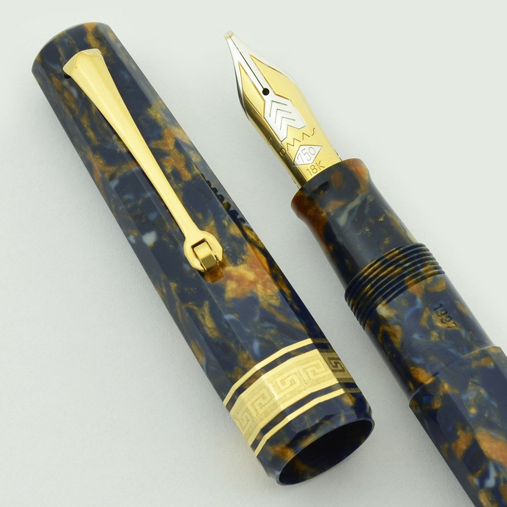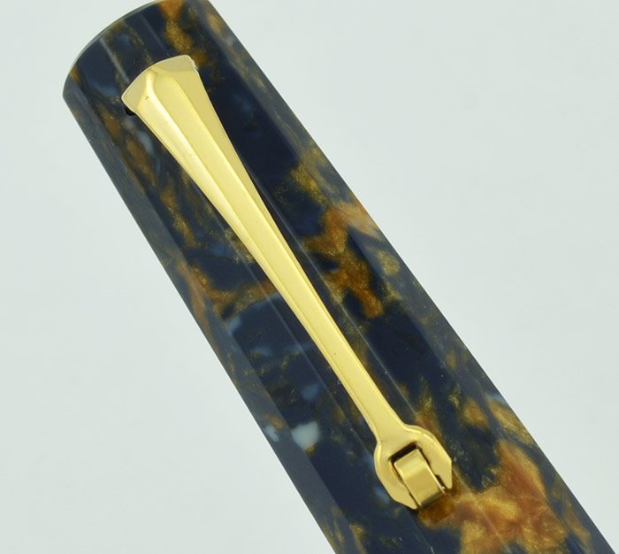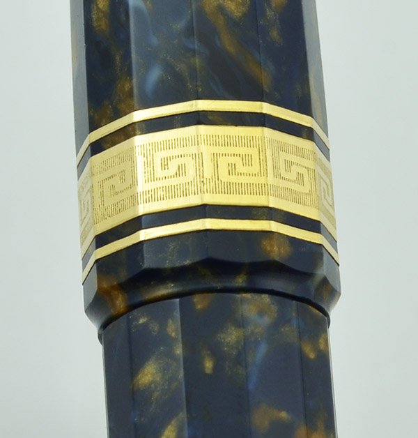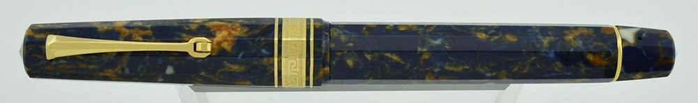 Color Blue and amber marbled celluloid. Saffron Blue (aka Senape Blue aka Autumn Blue) with gold plated trim. It has a Greek key pattern cap band.