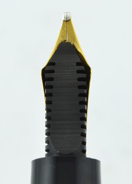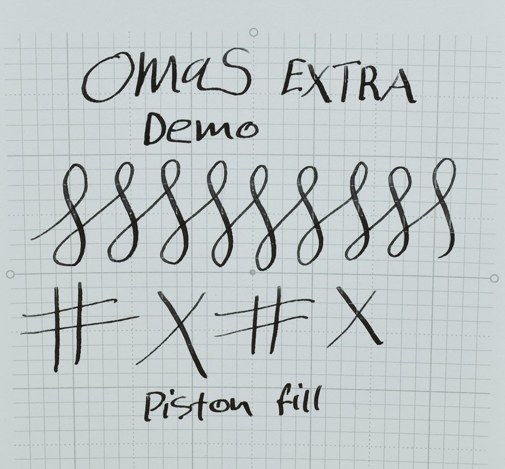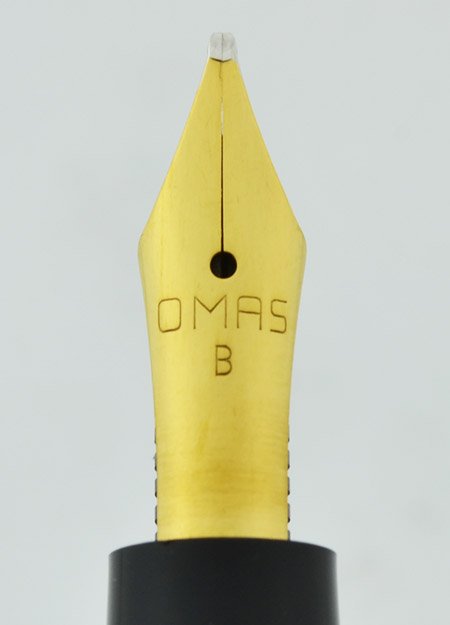 Nib BROAD ITALIC nib is really lovely, smooth with excellent tipping material. We assume it is gold plated, the only mark on it is "Omas B," and there is not a spot of wear on the plating. It produces really lovely fine lines on the side-stroke, and nice large broads on the down-stroke. It's got a little flexibility to it as well, on top of the italic cut. See our writing sample below.